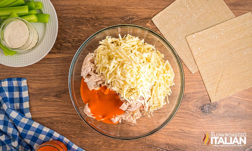 - In a bowl, mix together the shredded chicken, shredded mozzarella cheese, and buffalo sauce until well combined.