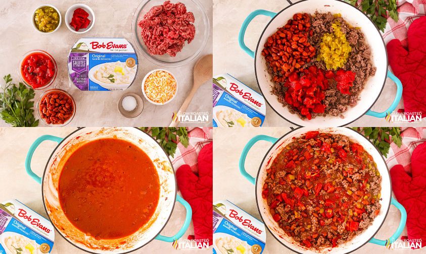 - Chili – Add chili beans, fire-roasted tomatoes with garlic, diced green chiles, and tomato paste to the ground beef to create the chili base.