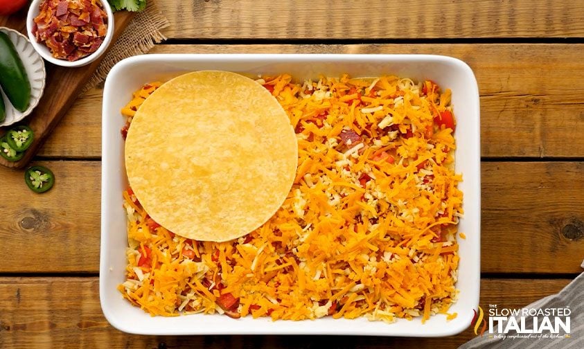 • Line bottom of prepared baking pan with 4 corn tortillas, overlapping if necessary. Top tortillas with 1/4 of tomato mixture, 1/4 of bacon and 1/4 of each cheese. Repeat layers 2 more times beginning with 4 tortillas and ending with cheeses.