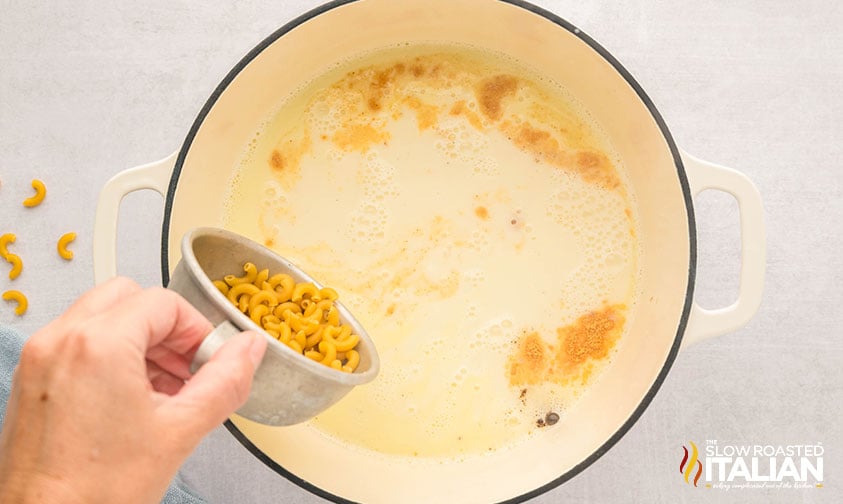 Not for mac and cheese soup! It cooks right in the broth base and soaks up all that extra flavor.