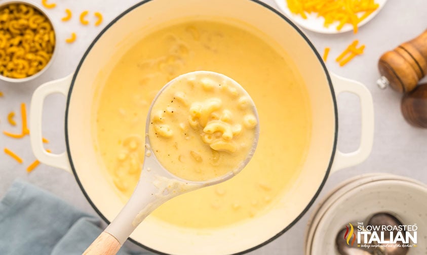 Itโs best served right away since it thickens quite a bit as it cools. But if you want to save leftovers, youโll have ultra creamy mac and cheese for the next day.
