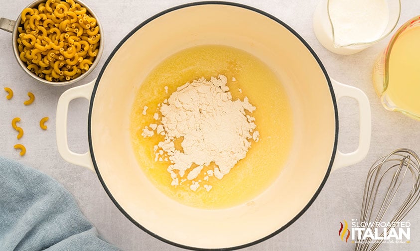 - Melt the Butter: Place a 4-quart pot over medium-high heat and melt the 4 tablespoons unsalted butter. This takes about 1 minute. It should be fully melted and gently bubbly, not browning.4 tablespoons all-purpose flour
