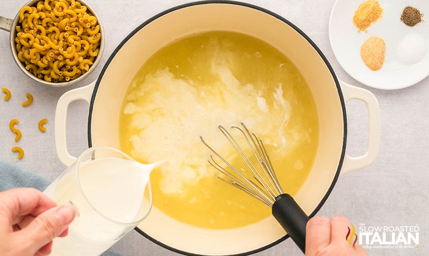 - Add the Liquids: Slowly whisk in 5 cups chicken stock and 1 cup heavy cream, a little at a time, until smooth. This takes 1โ2 minutes. The mixture should look like a thin, silky gravy.