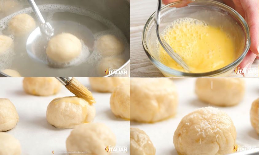 - Carefully, a sprinkle at a time, add baking soda to boiling water. USE CAUTION: IT WILL BUBBLE UP. Place dough balls into boil water a few at a time. Remove with a slotted spoon after 30 seconds. Place on parchment paper to cool and repeat.
