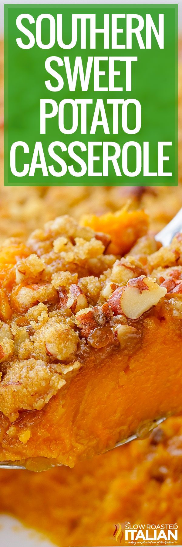 Southern Sweet Potato Casserole is rich and creamy, just like grandma used to make! Add a pecan streusel topping for extra crunch in each bite. With easy make-ahead instructions, this Southern sweet potato casserole recipe is perfect for the holidays and family dinners!