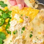 MIX DIP: In a large mixing bowl, add 2 cups shredded chicken, 1 can white beans, 1 can corn, 1 ½ cups shredded cheese, 1 ½ cups salsa verde, 8 ounces softened cream cheese, ½ cup sour cream, 1 can diced green chiles, and 2 teaspoons Mexican seasoning. Stir until fully combined and creamy.